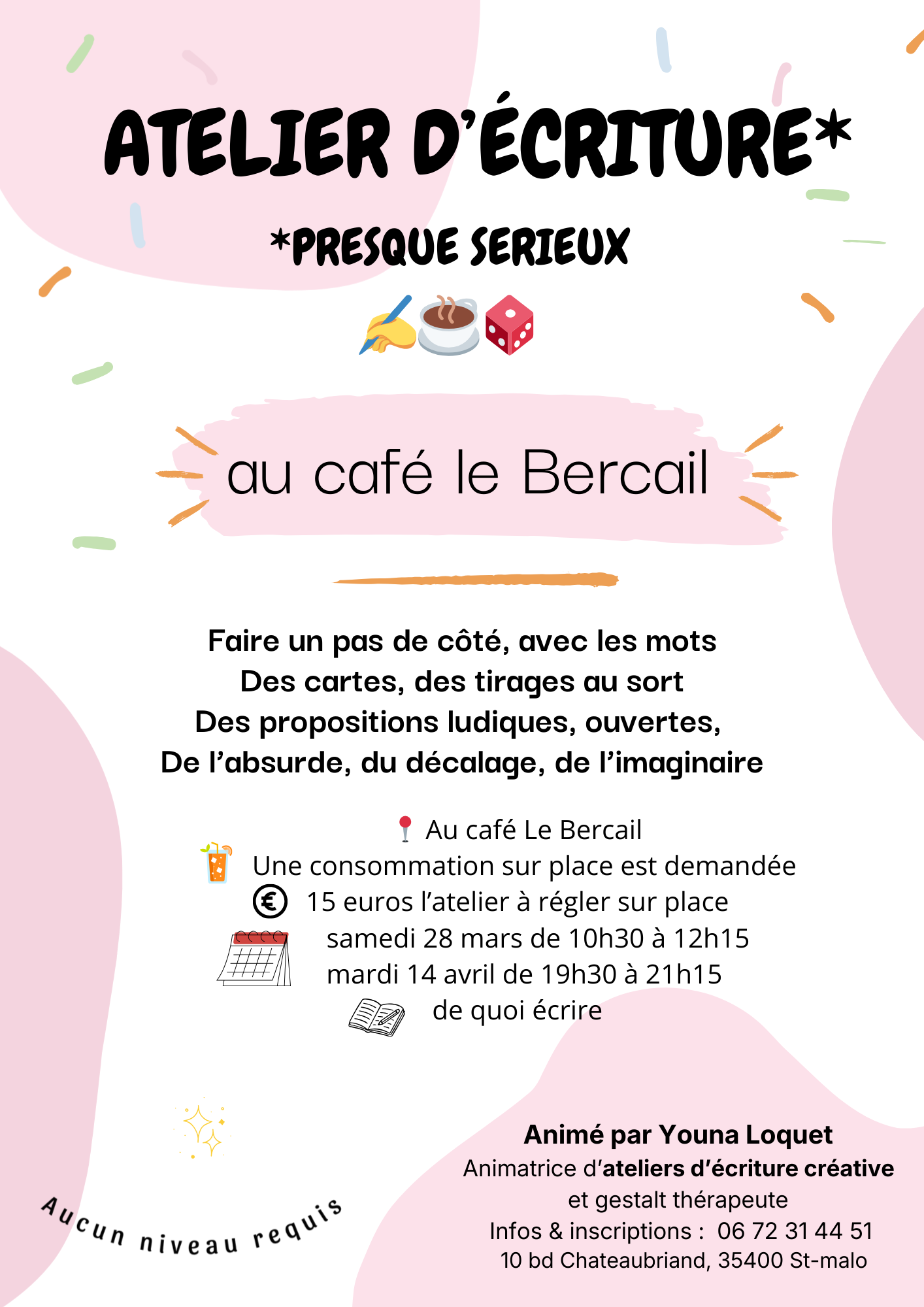 Atelier d'écriture avec Youna LOQUET à la Droguerie, samedi 21 mars, de 15h à 17h, sur le thème 'À la manière de Marcus Malte'